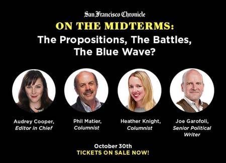Join The Chronicle for a LIVE voters' guide to the 2018 midterm elections. Hear from political insiders on the latest news surrounding local issues, state propositions, and the developing battles of the midterm elections. Tickets on sale now! Know the issues! Stay Informed! Vote Nov. 6! MODERATED BY Audrey Cooper, Editor in Chief FEATURING Joe Garofoli, Senior Political Writer Heather Knight, Columnist Phil Matier, Columnist Prices:Regular Price: USD 15.0Student Price: USD 5.0Subscriber Price (With Membership Promo Code): USD 10.0 Category: Lifestyle, Politics Date and Time: On Tuesday October 30, 2018 at 6:30 pm - 8:00 pm Venue Details: Gray Area / Grand Theater, 2665 Mission Street, San Francisco, 94110, United States Tickets: https://go.evvnt.com/287753-0?pid=5569